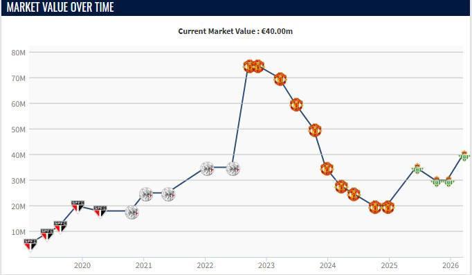 这位巴西边锋的巅峰身价是2022年9月的7500万欧元,那年夏窗,他以9500万欧元的转会费从阿贾克斯转会曼联,不过自那之后,由于表现不佳,他的身价一直在下跌,在曼联时曾跌到了2000万欧